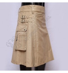 Khaki Utility Kilt. 2 Staps and Buckle Closing with 2 Span on Belt Line, One Snap inner side of Front Apron, 2 Side Pockets with full function.